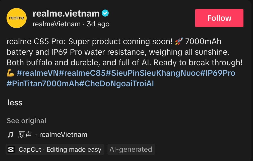 realme เตรียมที่จะเสริมพลังให้กับสมาร์ทโฟนรุ่นราคาประหยัดแล้วในตอนนี้ เป็นรุ่น C85 Pro ที่ตอนนี้มีทีเซอร์เล็กๆ เผยออกมาเรียบร้อยจาก realme ประเทศเวียดนาม