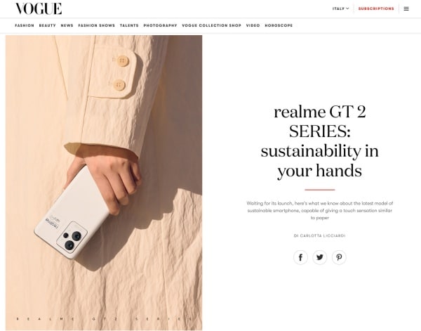 realme เชื่อว่าการใช้วัสดุที่แตกต่างสามารถทลายกรอบการออกแบบได้อย่างไร้ขีดจำกัด แม้การออกแบบสินค้าที่โดดเด่นจะถือเป็นหลักการสำคัญของแบรนด์ แต่ realme ก็จะไม่ยอมทำลายสิ่งแวดล้อมอย่างเด็ดขาด ด้วยความรับผิดชอบเพื่อความสวยงามนี้ จึงเป็นเหตุผลที่แบรนด์คิดว่าสไตล์และความยั่งยืนไม่จำเป็นต้องยืนอยู่คนละขั้วเสมอไป และเชื่อมั่นว่าสิ่งแวดล้อมและเทคโนโลยีจะสามารถอยู่ร่วมกันได้อย่างกลมกลืนพบนวัตกรรมเพื่อโลกกับ realme GT 2 SERIES เร็ว ๆ นี้