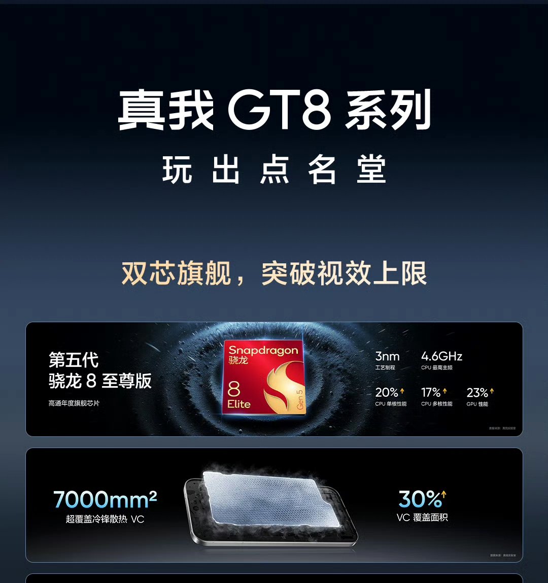 ขุมพลังจัดมาสุดๆ ด้วย Snapdragon 8 Elite Gen 5 ความเร็ว 4.6GHz ควบคู่กับชิป R1 เพื่อควบคุมประสิทธิภาพด้านกราฟิกด้วย มีแผ่นระบายความร้อน VC ขนาดใหญ่ 7,000 ตารางมิลลิเมตร ให้ RAM มาที่ 12/16GB LPDDR5X + ROM 256GB/512GB/1TB UFS 4.1 มีแบตเตอรี่ 7000mAh ชาร์จเร็วผ่านสาย 120W สามารถชาร์จ 0-50% ในเวลา 15 นาที และชาร์จไร้สาย 50W พร้อมรันบน Android 16 ครอบทับด้วย realme UI 7