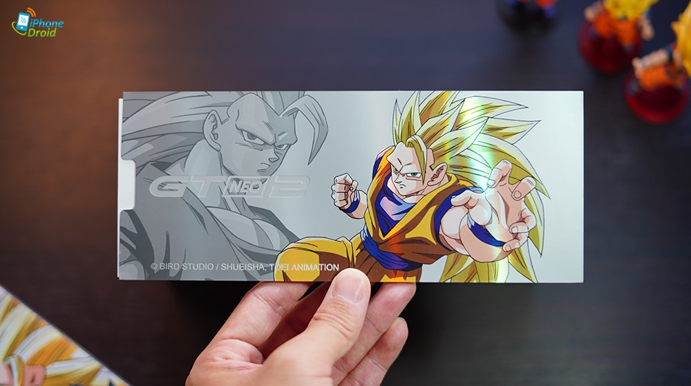ชุดพิเศษแบบนี้ความหวือหวาก็เริ่มตั้งแต่กล่องกันเลย realme GT Neo2 Dragon Ball Edition มาพร้อมกล่องทรงเดียวกับรุ่นปกติ แต่…ความพิเศษก็คือลวดลายที่หน้ากล่องที่มีภาพ “โกคู” ทั้ง 3 ร่างประกอบอยู่ที่ด้านหน้า พร้อมชื่อรุ่นอยู่มุมซ้ายบน โลโก้ Toei อยู่ที่มุมขวา มั่นใจได้ว่านี่ของลิขสิทธิ์นะจ๊ะ