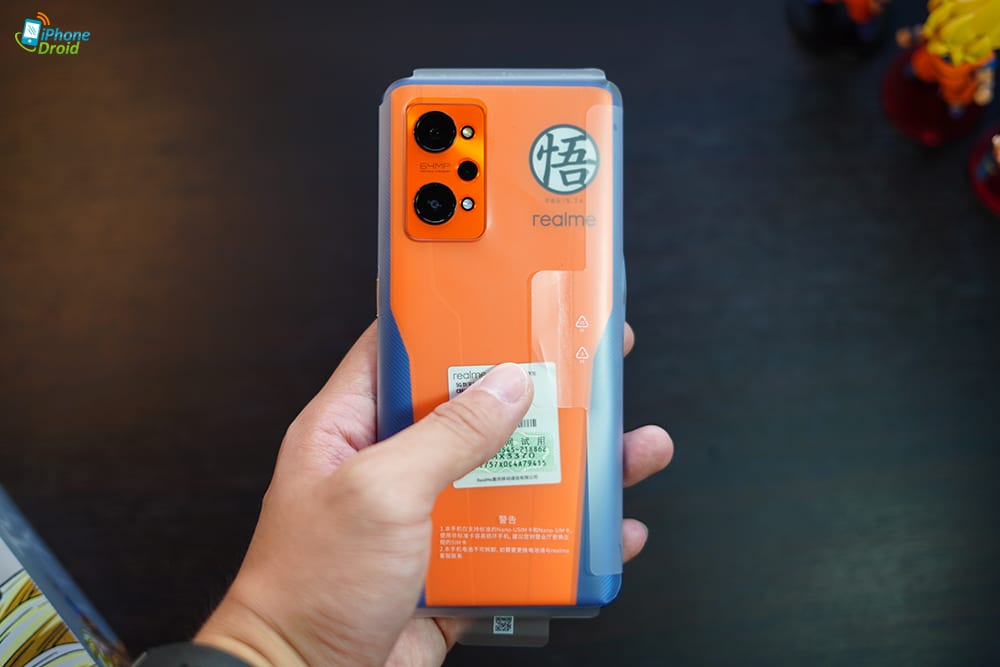 ที่มุมขวาของด้านหลังยังมีโลโก้ “โก” แบบที่ติดอยู่ตรงอกขวาของโกคูอีกด้วย ถัดลงมาเป็นโลโก้ realme ครับ ส่วนกล้องหลังของรุ่นนี้ก็วางสลับกันเป็นสี่เหลี่ยมคู่กับไฟแฟลชอีก 2 ดวง มองเผิน ๆ ก็เหมือนลูกดราก้อนบอลวางกองกันอยู่เหมือนกัน ถึงแม้จะไม่ครบ 7 ลูกก็เถอะ (พลังมโนล้วน ๆ)