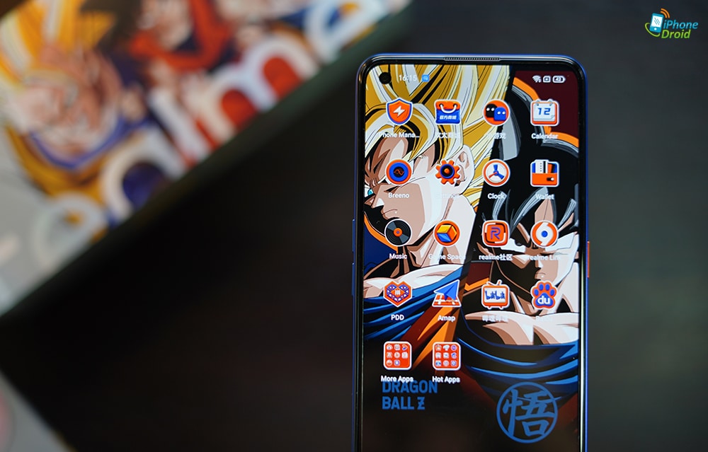 พลิกกลับมาดูที่หน้าจอกันบ้าง realme GT Neo2 Dragon Ball Edition ยังใช้ดีไซน์แบบ Punch Hole Display เหมือนรุ่นปกติ แต่…สิ่งที่พิเศษกว่าคือ UI ที่มีการปรับแต่งมาใหม่หมดให้เป็น Dragon Ball Edition เริ่มที่ Wallpaper ที่ใช้เป็นภาพโกคู ซึ่งให้มาเลือกได้ถึง 3 แบบจะเป็นภาพคู่ซูเปอร์ไซย่า, ไซย่าร่าง 3 หรือซูเปอร์ไซย่าปกติครับ