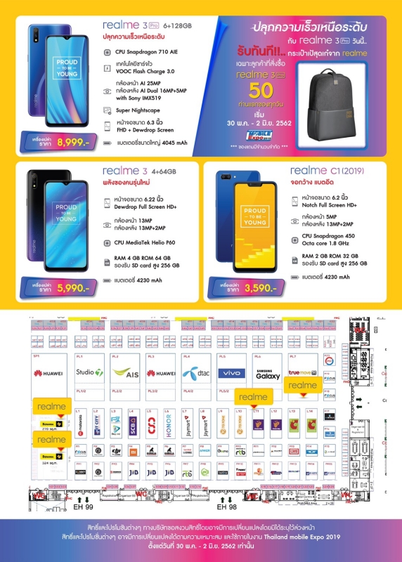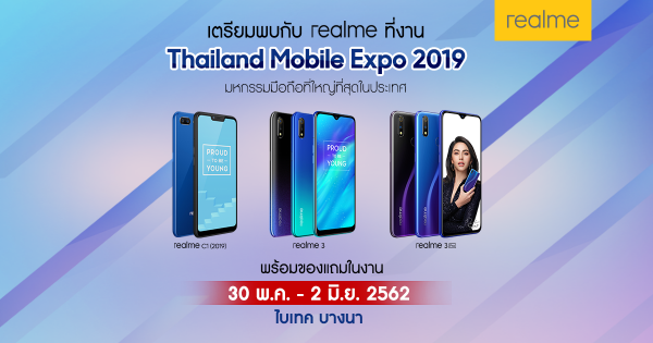 สำหรับผลิตภัณฑ์ของ realme จะมีจำหน่ายในบู้ทของ True Move H , Power buy และ Banana IT ภายในงาน Thailand Mobile Expo ตั้งแต่วันที่30 พ.ค. – 2 มิ.ย 2562 นี้ ณ ไบเทค บางนา ห้ามพลาดเด็ดขาด!!!