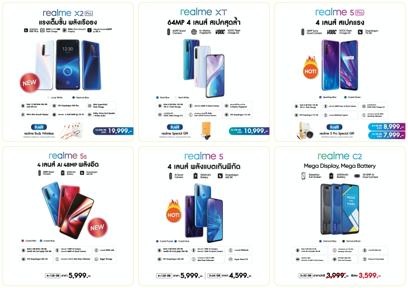 - เมื่อซื้อ realme X2 Pro ‘แรงเต็มขั้น พลังเรือธง’ ราคาเริ่มต้นที่ 19,999 บาท รับฟรีทันทีหูฟัง realme Buds Wireless มูลค่า 1,999 บาท พร้อมการรับประกันตัวเครื่