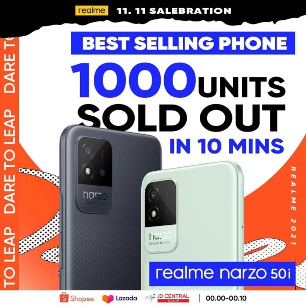 อีกหนึ่งรุ่นยอดนิยมเหมือนกัน คือ สมาร์ตโฟนรุ่นเริ่มต้นราคาสุดคุ้ม แต่อัดแน่นด้วยคุณภาพ กับ “realme narzo 50i” ที่สามารถขายได้ 1,000 เครื่อง ภายใน 10 นาทีเท่านั้น โดยความโดดเด่นของสมาร์ตโฟนรุ่นนี้ คือ การให้จอใหญ่สะใจถึง 6.5 นิ้ว และแบตเตอรี่ความจุมากถึง 5,000mAh รองรับการใช้งานทั่วไปได้ดีเยี่ยม โดยเฉพาะสายเสพคอนเทนต์ที่เน้นดูหนังฟังเพลงต่อเนื่องยาวนานตลอดวัน