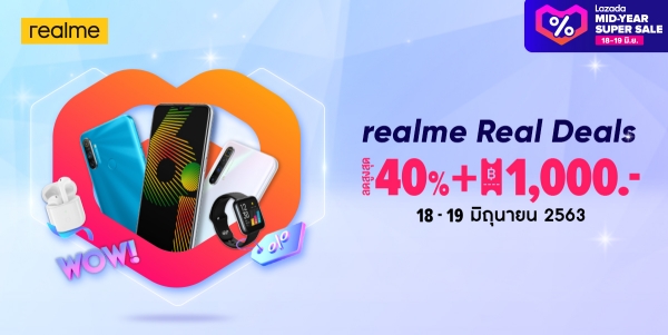 realme แบรนด์สมาร์ทโฟนเพื่อคนรุ่นใหม่ที่เติบโตเร็วที่สุดในโลก ร่วมมือกับ Lazada ใน realme x Lazada-Mid Year Super Sale จัด realme Real Deals แคมแปญสุดพิเศษกลางปี นำทัพสมาร์ทโฟนมาลดราคาจัดเต็มพร้อมมอบโค้ดส่วนลดสูงสุดถึง 1,000 บาท นอกจากนี้ ทุกคำสั่งซื้อแรกตามช่วงเวลาที่กำหนดรับเพิ่มฟรี! realme Buds Air และ realme Powerbank และ พิเศษสำหรับ Top Spender ลุ้นเป็นเจ้าของ realme 5s และของรางวัลมากกว่า 10,000 บาท เฉพาะวันที่ 18-19 มิถุนายนนี้ ใน realme Flagship Store ทาง Lazada เท่านั้น