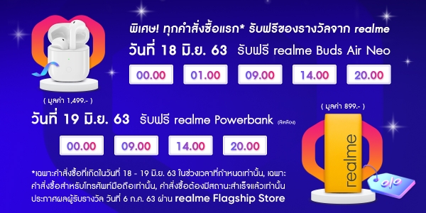 - เฉพาะ 18 มิถุนายน 63 รับฟรี! realme Buds Air Neo สีขาว มูลค่า 1,499 บาท สำหรับคำสั่งซื้อแรกที่เป็นสมาร์ทโฟนในช่วงเวลา 00.00น. 01.00น. 09.00น. 14.00น. และ 20.00น. (ทั้งหมดจำนวน 5 รางวัล)