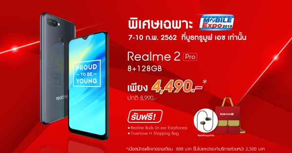 โดยจะเปิดจำหน่าย Realme 2 Pro 8+128GB ผ่านทางบูธของทรูมูฟ เอชในราคาพร้อมโปรโมชั่นของทรู เพียง 4,490 บาท (จากปกติ 4,990 บาท) พร้อมกับของแถมอีกมากมาย สำหรับ 10 คนแรกที่ซื้อ Realme 2 Pro ของในแต่ละวันจะได้รับ กระเป๋าเป้ Realme คนละ 1 ใบ หลังจากนั้นอีก 25 คนถัดมาที่ซื้อ Realme จะได้รับหูฟัง Realme Buds คนละ 1 อัน และหลังจากนั้นก็เป็นเสื้อสุดสวยจาก Realme นอกจากนี้ยังมีกระเป๋าสุดเก๋จากทรูมูฟ เอชแถมให้อีกด้วย