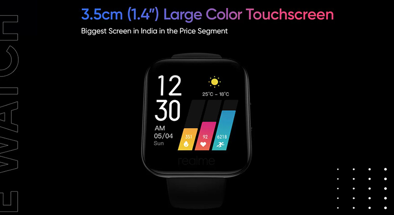 realme Watch มาพร้อมกับหน้าจอสัมผัสแบบสี ชนิด LCD ขนาด 1.4 นิ้ว ความละเอียด 320 x 320 พิกเซล ครอบทับด้วยกระจก Corning Gorilla Glass 3 โดยผู้ใช้งานสามารถเปลี่ยนหน้าปัดได้ 12 รูปแบบที่มีให้ในตัว หรือหากเชื่อมต่อผ่านแอปพลิเคชั่น realme Link จะมีให้เลือกอีกหลายร้อยแบบ และมีแบตเตอรี่ที่ 160mAh ใช้งานได้ต่อเนื่อง 9 วัน
