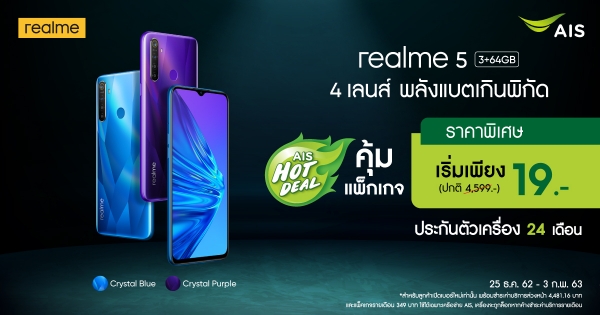realme ร่วมกับ AIS จัดโปรโมชั่นเด็ด ซื้อ realme 5 ในราคาที่ไม่มีใครกล้าให้เพียง 19 บาท เพียงสมัครแพ็กเกจสุดคุ้ม และชำระค่าบริการล่วงหน้า โปรโมชั่น 349 บาท ระยะเวลา 12 เดือน (โดยไม่ต้องชำระค่าบริการอินเทอร์เน็ตเพิ่มตลอดระยะเวลา 12 เดือน) ใช้งานอินเทอร์เน็ตได้สูงสุด 30 GB โทรฟรี ในเครือข่าย 24 ชั่วโมง นอกเครือข่ายฟรี 100 นาที !! โปรโมชั่นนี้สำหรับ realme 5 ความจุ 3+64 GB ตั้งแต่วันนี้ ถึงวันที่ 3 กุมภาพันธ์ 2563 เท่านั้น
