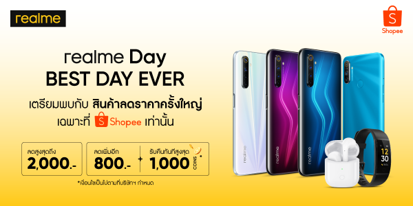 realme แบรนด์สมาร์ทโฟนเพื่อคนรุ่นใหม่ที่เติบโตเร็วที่สุดในโลก ร่วมมือกับ Shopee จัดแคมเปญ realme Day วันสุดพิเศษกับการลดราคาครั้งใหญ่ฉลองวันเงินเดือนออก นำทัพสมาร์ทโฟนสเปคจัดเต็มและผลิตภัณฑ์ AIoT มากมายมาลดราคาพิเศษทั้งวันแบบจัดเต็ม มอบส่วนลดสูงสุด 2,000 บาท พร้อม Voucher ลดเพิ่มสูงสุดอีก 800 บาท และรับคืนทันทีสูงสุด 1,000 Coins ที่ realme Official Store ใน Shopee เฉพาะวันที่ 30 เมษายนนี้เท่านั้น
