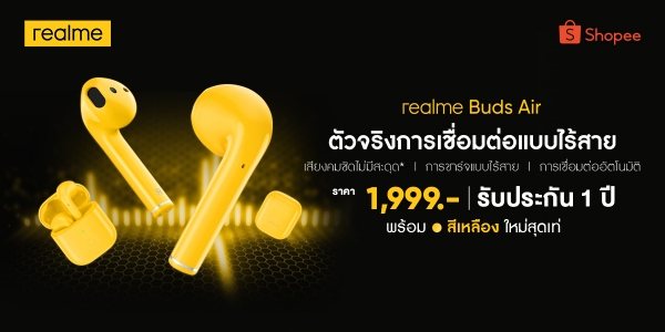 นอกจากสมาร์ทโฟนที่ realme ยกขบวนมาจัดโปรโมชั่นอย่างสุดคุ้มแล้ว ยังมีผลิตภัณฑ์ AIoT อย่าง realme Buds Air ตัวจริงการเชื่อมต่อแบบไร้สาย ที่มาพร้อมสีเหลืองใหม่สุดเท่ เปิดประสบการ์ณเสียงทรงพลังคมชัดแบบไร้ข้อจำกัด วางจำหน่ายในราคาเพียง 1,999 บาท พร้อมการรับประกันตัวเครื่องนาน 1 ปี