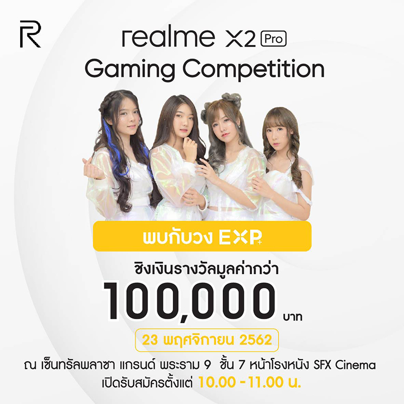 realme แบรนด์สมาร์ทโฟนเพื่อคนรุ่นใหม่ผู้ผลิตสมาร์ทโฟนที่เน้นนำเสนอประสบการณ์ที่ดีที่สุดให้กับผู้บริโภค เดินหน้าผลักดันวงการ esports จัดการแข่งขัน realme X2 Pro Gaming เพื่อประลองฝีมือเฟ้นหาสุดยอดแชมป์ในการแข่งขัน ROV ชิงรางวัลมูลค่ารวมกว่า 100,000 บาท ในวันที่ 23 พฤศจิกายน 2562 ที่ศูนย์การค้าเซ็นทรัล แกรนด์ พลาซ่า พระราม 9 และในวันที่ 27 พฤศจิกายน 2562 ที่ มหาวิทยาลัยอัสสัมชัญ วิทยาเขตสุวรรณภูมิ เปิดให้ลงทะเบียนระหว่างเวลา 10.00 – 11.00 น. และพบกับโชว์สุดพิเศษจากวง EXP
