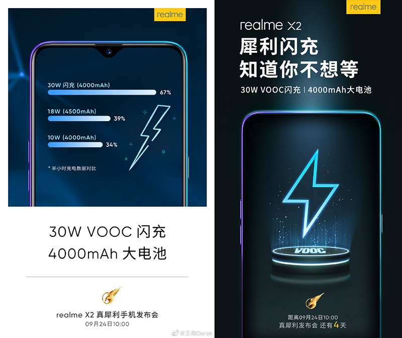 สำหรับสเปคเพิ่มเติมของ realme X2 ได้มีการระบุเพิ่มเติมจาก Weibo ของ realme เอง โดยความเร็วที่ VOOC Flash Charge 4.0 สามารถทำได้ในรุ่นนี้ ใน 30 นาทีสามารถชาร์จได้จาก 0% – 67% เลยทีเดียว ขณะที่เมื่อเทียบกับกำลังไฟ 10W จะชาร์จได้เพียง 34% เท่านั้น ส่วนกำลังไฟ 18W ที่ชาร์จแบตเตอรี่ความจุ 4,500mAh สามารถชาร์จได้เพียง 39%