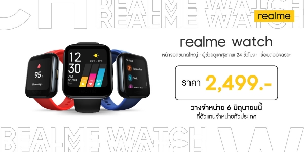 นอกจากนี้ เมื่อต้นปีที่ผ่านมา realme มียอดการจำหน่ายผลิตภัณฑ์ AIoT มากถึง 1 ล้านเครื่อง แสดงให้เห็นถึงการเติบโตที่รวดเร็วเป็นอย่างมาก ล่าสุด realme เปิดตัวผลิตภัณฑ์ AloT สุดพิเศษอย่าง realme Watch นาฬิกาข้อมืออัจฉริยะ ที่จะมาเป็นผู้ช่วยดูแลสุขภาพของคุณ ไม่ว่าจะวัดอัตราการเต้นของหัวใจแบบเรียลไทม์หรือระดับออกซิเจนในเลือด และฟีเจอร์ดูแลสุขภาพอื่นๆ ตลอด 24 ชั่วโมง โดยพร้อมวางจำหน่ายในวันที่ 6 มิถุนายนนี้ ในราคาเพียง 2,499 บาท ที่ realme Brand Shop และตัวแทนจำหน่ายทั่วประเทศ