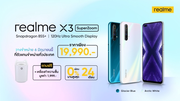 realme แบรนด์สมาร์ทโฟนเพื่อคนรุ่นใหม่ที่เติบโตเร็วที่สุดในโลก หลังจากประสบความสำเร็จกับสมาร์ทโฟนเรือธงรุ่นแรกอย่าง realme X2 Pro เมื่อเร็วๆนี้ realme ได้มีการเปิดตัวสมาร์ทโฟนพลังแรงรุ่นใหม่อย่าง realme X3 SuperZoom สมาร์ทโฟนเรือธงรุ่นแรกที่มาพร้อมเลนส์ Periscope พลังซูม 60 เท่า ·มีการอัพเกรดด้วยประสิทธิภาพการประมวลผลเร็วแรงทรงพลังด้วยชิปเซ็ต Snapdragon 855+ และหน้าจอลื่นไหลด้วยอัตรา Refresh rate 120 Hz ล่าสุด realme เตรียมวางจำหน่าย realme X3 SuperZoom ในราคาเพียง 19,990 บาท พร้อมโปรโมชั่นผ่อน 0% นานสูงสุด 24 เดือน พิเศษ ! รับฟรีเครื่องทำความชื้นมูลค่า 1,999 บาท วางจำหน่ายพร้อมกันในวันที่ 6 มิถุนายน นี้ ทาง realme Brand Shop และตัวแทนจำหน่ายทั่วประเทศ