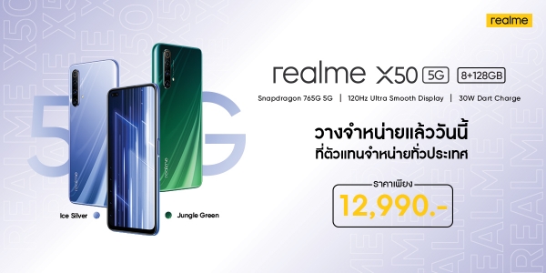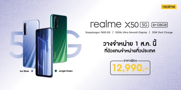 เมื่อเร็วๆนี้ realme แบรนด์สมาร์ทโฟนเพื่อคนรุ่นใหม่ที่เติบโตเร็วที่สุดในโลก ได้มีการจัดเซอร์ไพรส์เปิดตัวอีกหนึ่งสมาร์ทโฟน 5G อย่าง realme X50 5G ในงานเปิด realme Flagship store ศูนย์การค้าเซนทรัลเวิลด์ที่ผ่านมา เพื่อตอบโจทย์ไลฟ์สไตล์ผู้ใช้งาน 5G ได้อย่างครอบคลุมยิ่งขึ้น โดย realme X50 5G มาพร้อมชิปเซ็ต Snapdragon 765G 5G หน้าจอขนาด 6.57 นิ้ว ไหลลื่นด้วยอัตรา Refresh Rate 120Hz รองรับเทคโนโลยีชาร์จเร็ว 30W Dart Charge สามารถชาร์จเต็ม 100% ในเวลาเพียง 55 นาที วางจำหน่ายพร้อมกันในวันที่ 1 สิงหาคมนี้ ในราคาเพียง 12,990 บาท ที่ realme Brand Shop และตัวแทนจำหน่ายทั่วประเทศ