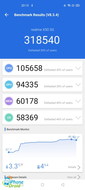 สำหรับผลการทดสอบทดสอบประสิทธิภาพโดยรวมตั้งแต่หน่วยประมวลผล, การ์ดจอ และหน่วยความจำด้วยโปรแกรม AnTuTu Benchmark ทำคะแนนได้ไปได้ที่ 318,540