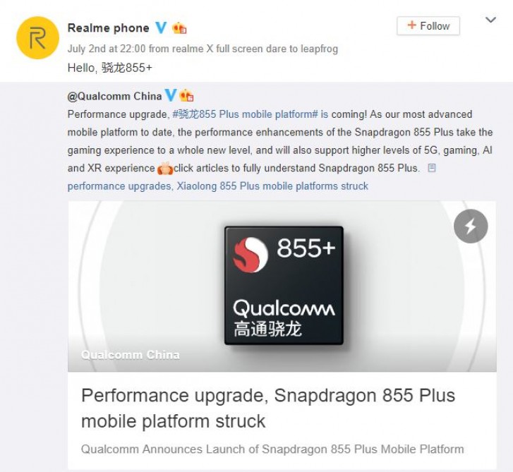 ล่าสุดทาง Realme ก็ออกมาบอกผ่านเว็บไซต์ Weibo เช่นกันว่าจะใช้ชิปเซ็ต Snapdragon 855 Plus กับสมาร์ทโฟนเรือธงรุ่นต่อไปซึ่งตอนนี้ทาง Realme เองได้ก็ยังไม่เคยใช้งาน Snapdragon 800 Series เลยซักครั้ง นี่อาจจะเป็นสัญญาณว่า Realme อาจจะกระโดดเข้าสู่ตลาดสมาร์ทโฟนที่สูงขึ้นมาอยู่ในระดับพรี่เมี่ยมก็เป็นไปได้