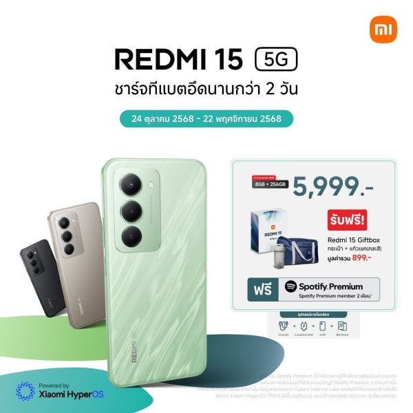 • REDMI 15 5G รุ่นความจุ 8GB + 256GB มีให้เลือก 3 สี ได้แก่ Ripple Green, Titan Gray และ Midnight Black2 วางจำหน่ายในราคา 5,999 บาท ที่ Xiaomi Store, ร้านตัวแทนจำหน่ายที่ร่วมรายการทั่วประเทศ และช่องทางการจัดจำหน่ายทางออนไลน์ พิเศษ! เมื่อซื้อ REDMI 15 5G ระหว่างวันที่ 24 ตุลาคม 2568 – 22 พฤศจิกายน 2568 รับฟรี REDMI 15 Giftbox กระเป๋าและแก้วเชคคละสีมูลค่ารวม 899 บาท และฟรี! Spotify Premium member 2 เดือนเฉพาะผู้ใช้แพ็กเกจพรีเมียมส่วนบุคคล (Premium Individual)17