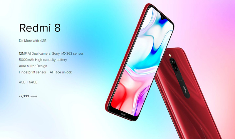 Redmi 8 มีให้เลือก 3 สี ได้แก่ Sapphire Blue, Onyx Black และ Ruby Red สนนราคาเริ่มต้นที่ 7,999 รูปี (ประมาณ 3,400 บาท) โดยจะเริ่มวางจำหน่ายอย่างเป็นทางการที่อินเดียในวันที่ 12 ตุลาคมนี้ผ่าน Mi.com และ Flipkart