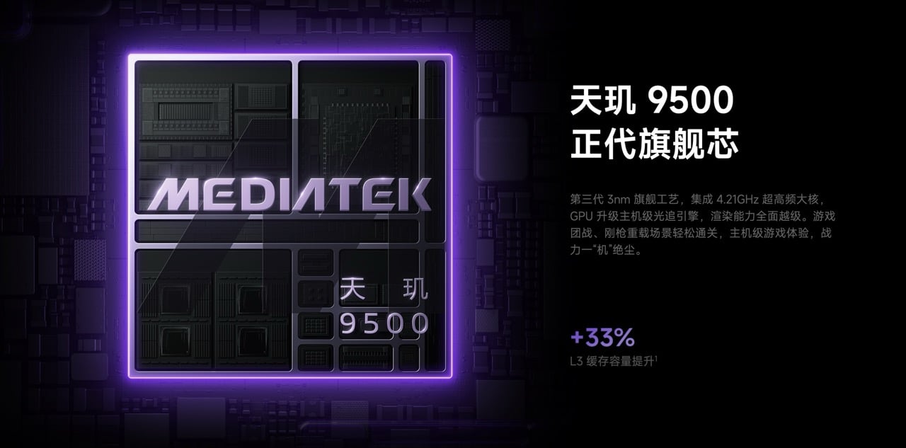 ชิปเซ็ตที่ใช้จะเป็น Dimensity 9500 ตัวท็อป ควบคู่กับหน่วยความจำระดับสูงสุด RAM LPDDR5X และ ROM UFS 4.1 ภายในยังมีระบบระบายความร้อนขนาดใหญ่ 15300 ตารางมม.ที่ช่วยลดอุณหภูมิลงได้ 4⁰c รวมถึงให้ประสิทธิภาพเสถียรขึ้นอีก 10%