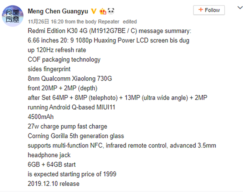 สำหรับ Redmi K30 นอกจากที่จะมีเวอร์ชัน 5G ที่เตรียมเปิดตัวในวันที่ 10 ธันวาคมนี้ ล่าสุด ในเวอร์ชัน 4G ก็มีสเปคหลุดออกมาเหมือนกันผ่านทาง Weibo