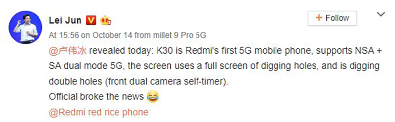 หลังจากที่ Xiaomi ได้จัดงาน Xiaomi Developers Conference ที่กรุงปักกิ่ง ประเทศจีนไปได้นานมานี้ ด้าน Lei Jun ซีอีโอของบริษัท ได้ยืนยันแล้วว่า Redmi K30 จะมาการเปิดตัวอย่างเป็นทางการภายในเดือนธันวาคมนี้