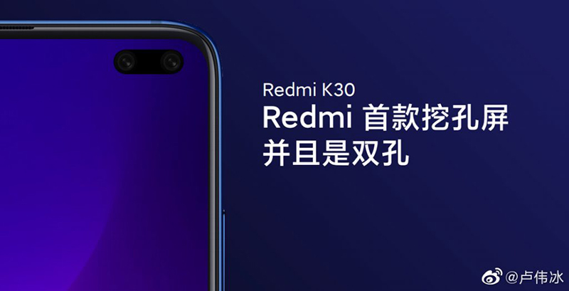 สำหรับ Redmi K30 จะมาพร้อมกับหน้าจอแสดงผลกล้องเจาะรูถึง 2 เลนส์ คล้ายกับ Samsung Galaxy S10+ ซึ่ง Redmi K30 จะเป็นสมาร์ทโฟนรุ่นแรกของแบรนด์ที่ใช้หน้าจอแบบ Punch Hole อีกด้วย