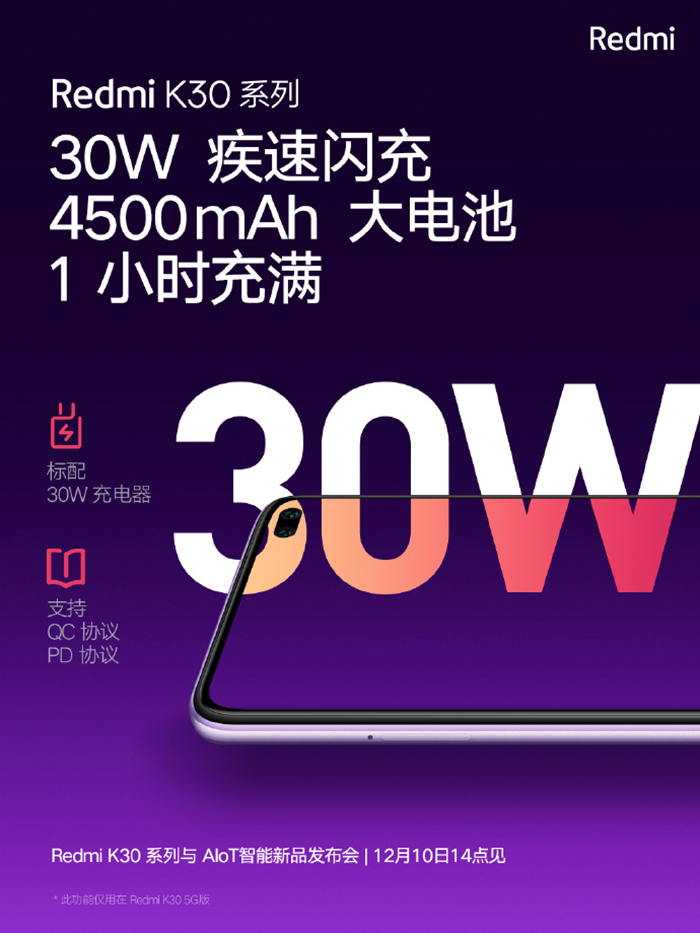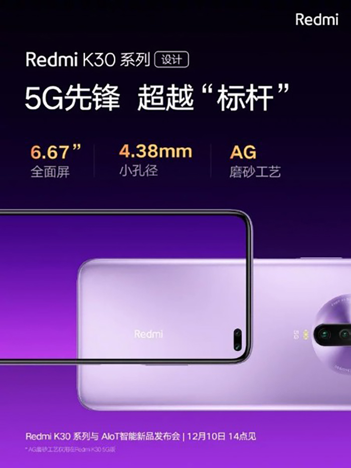 ทั้งนี้ สเปคของ Redmi K30 ตามภาพทีเซอร์จะมาพร้อมกับหน้าจอกว้าง 6.67 นิ้ว และมีกล้องหน้าแบบ Punch Hole ยาว 4.38 มม. ตัดออกมาจากฝั่งมุมขวาบน โดยจะมีกล้องหลังความละเอียด 64 ล้านพิกเซล เซ็นเซอร์ Sony IMX686 ควบคู่กับอีก 3 เลนส์ความละเอียด 8 + 5 + 2 ล้านพิกเซล รวมไปถึงแบตเตอรี่ที่จะมีความจุ 4500mAh รองรับ Fast Charge 30W ด้วย โดยมีเทคโนโลยี MI-FC ที่ช่วยเพิ่มระยะเวลาในการชาร์จขั้นสูงต่อเนื่องสูงสุดถึง 80%