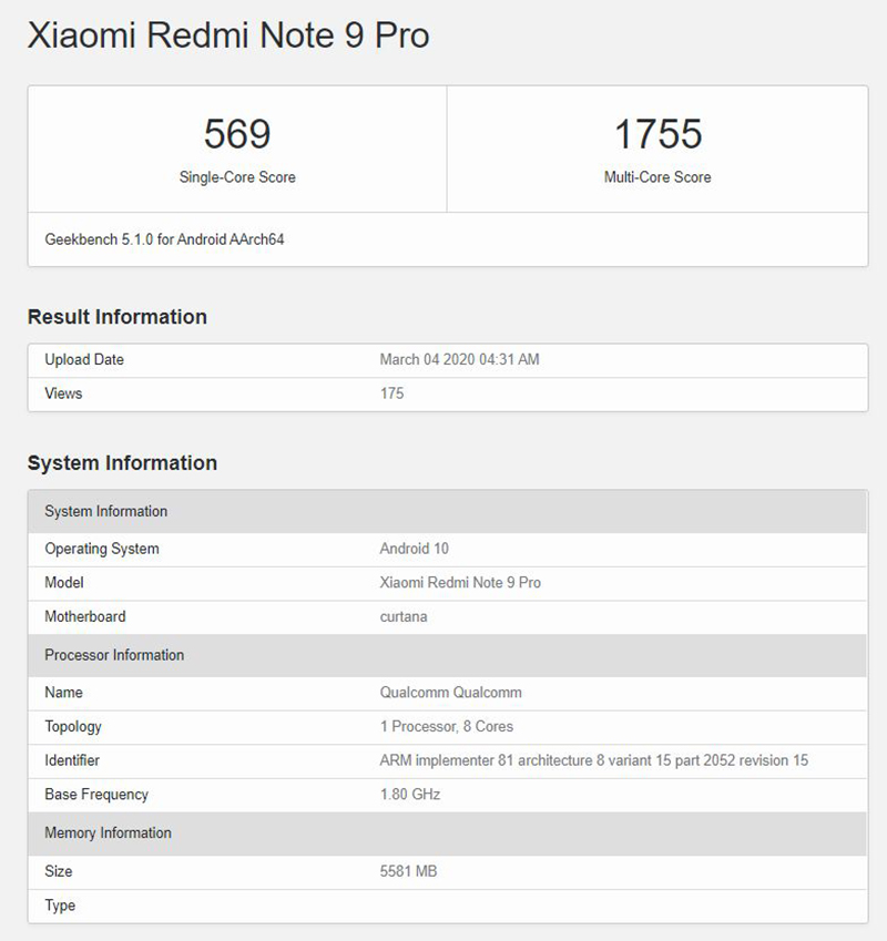 ตามที่ปรากฏบน Geekbench ทาง Redmi Note 9 Pro รันบนระบบปฏิบัติการ Android 10, มี RAM 6GB ส่วน CPU นั้นใช้ของ Qualcomm ที่มีโค๊ดเนมว่า “curtana” ซึ่งยังไม่เคยได้ยินว่าเป็น Snapdragon รุ่นไหนมาก่อน