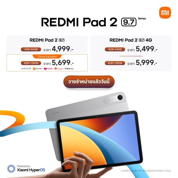 • REDMI Pad 2 9.7 รุ่นความจุ 4GB+128GB วางจำหน่ายในราคา 5,699 บาท ที่ mi.com, Lazada, Shopee และ TikTok Shop เท่านั้น