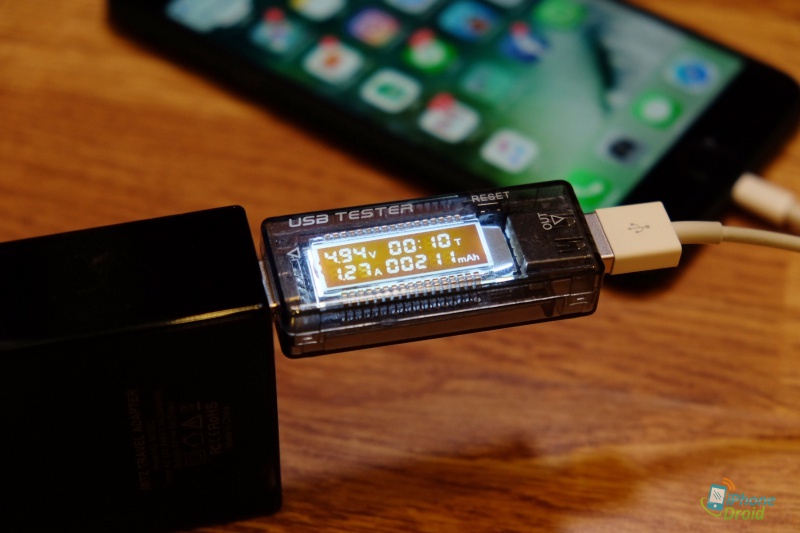 แต่เมื่อชาร์จกับ MITZ travel adapter กระแสวิ่งสูงสุด 1.27A ซึ่งการทดสอบนี้ทำให้เห็นว่า หากชาร์จด้วย travel adapter ตัวนี้ก็จะทำให้ชาร์จ iPhone ได้เต็มเร็วมากขึ้นกว่าเดิม รวมไปถึงสมาร์ทโฟน Android ก็จะช่วยให้ชาร์จเต็มได้เร็วกว่าการชาร์จด้วยหัวชาร์จทั่วไป