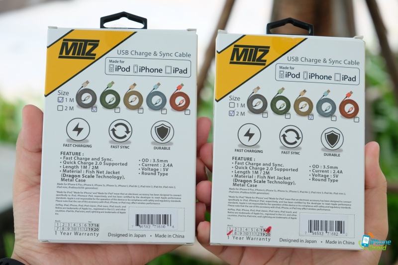 สาย Lightning สำหรับ iPhone, iPod, iPad และ Micro USB สำหรับ Android ด้านหน้ากล่องจะเป็นช่องพลาสติกใส มองเห็นสี และสายว่าเป็นชนิดไหน
