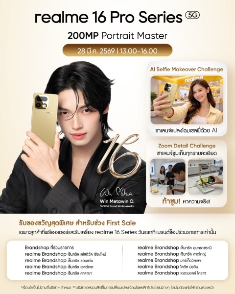 ไม่ว่าคุณจะเป็นสายแข่งขัน สายคอนเทนต์ หรือแฟนเกมตัวจริง นี่คือโอกาสที่จะได้สัมผัสประสบการณ์เกมมิ่งระดับโปรลีกแบบใกล้ชิดที่สุด พร้อมร่วมเป็นส่วนหนึ่งของโมเมนต์แห่งความมันส์ที่รวมทุกพลังของวงการอีสปอร์ตไว้ในที่เดียว เตรียมตัวให้พร้อม แล้วมาระเบิดความมันส์ไปด้วยกันที่บูท realme (ก่อนทางเข้าเช็กอินงาน) วันที่ 4–5 เมษายน 2569 ณ BITEC Live ไบเทค บางนา ตั้งแต่เวลา 10.00 น. เป็นต้นไป แล้วคุณจะรู้ว่า “พลังเกมมิ่งตัวจริง” เป็นอย่างไร เมื่อได้สัมผัสกับ realme 16 Series 5G สมาร์ตโฟนที่เกิดมาเพื่อเกมเมอร์ยุคใหม่อย่างแท้จริงติดตามข่าวสารกิจกรรมต่าง ๆ จาก realme Thailand ผ่านช่องทาง