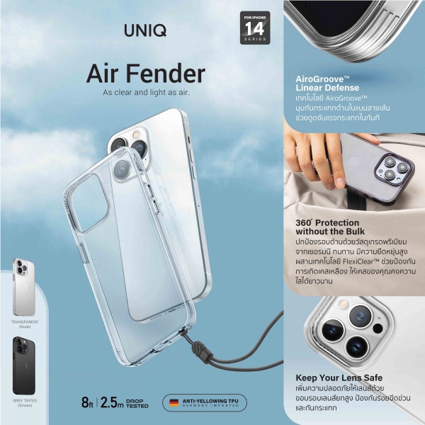 • รุ่น AIR FENDER เคสใสที่มาพร้อมความเพรียวบางและเบาดุจอากาศ เสริมการปกป้องด้วยเทคโนโลยี AiroGroove™ ซึ่งเป็นการออกแบบมุมกันกระแทกด้านในแบบลายเส้นเพื่อช่วยดูดซับแรงกระแทกในทันที ผ่านการทดสอบว่าสามารถรองรับแรงกระแทกจากการตกจากที่สูงได้ถึง 8 ฟุต (2.5 เมตร) ผลิตด้วยวัสดุ TPU คุณภาพสูงจากเยอรมนี ทำให้ตัวเคสมีความทนทานและยืดหยุ่นสูง สามารถบิดงอได้ โดยไม่เสียรูปทรง ผสานเทคโนโลยี FlexiClear™ ซึ่งมีคุณสมบัติป้องกันการเกิดเคสเหลือง UNIQ รุ่น AIR FENDER มี 2 สี ได้แก่ สี TRANSPARENT (Nude) และ สี GREY TINTED (Smoke) วางจำหน่ายในราคา 690 บาท