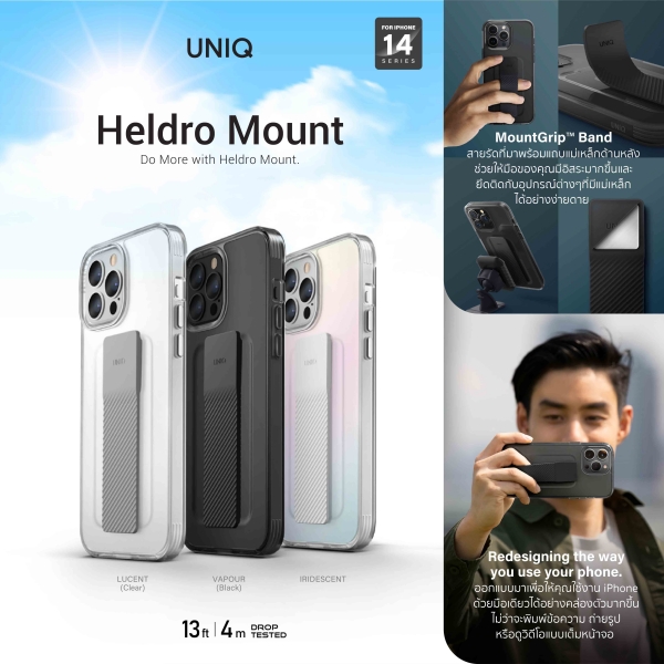 • รุ่น HELDRO MOUNT มาพร้อมMountGrip™ สายรัดพร้อมแถบแม่เหล็กด้านหลังที่ได้รับการจดสิทธิบัตร ให้คุณใช้งาน iPhone ด้วยมือเดียวได้อย่างคล่องตัว ไม่ว่าจะเป็นการดูวิดีโอ ถ่ายภาพ รวมถึงสลับการใช้งานระหว่างแอปต่างๆได้อย่างง่ายดาย นอกจากนี้ ยังช่วยให้คุณดูหน้าจอได้สะดวกมากยิ่งขึ้น เพราะสามารถยึดติดเข้ากับอุปกรณ์เสริมในรถหรือยึดติดกับผนังที่มีแม่เหล็กได้ ตัวเคสผลิตจากวัสดุ TPU และ PC ดีไซน์แบบ Quick-release band ช่วยให้เปลี่ยนสีของสายรัดได้อย่างรวดเร็ว พร้อมเพิ่มความปลอดภัยให้เลนส์ด้วยขอบรอบเลนส์ยกสูงและปุ่มสัมผัสที่กดได้ง่าย และยังมีสายคล้องข้อมือปรับระดับได้ที่ออกแบบมาอย่างแข็งแรงเพื่อความปลอดภัยขั้นสุด เพื่อให้คุณใช้งานได้โดยไม่ต้องกลัวการตกหล่น ผ่านการทดสอบว่าสามารถรองรับแรงกระแทกจากการตกจากที่สูงได้ถึง 13 ฟุต (4 เมตร) UNIQ รุ่น HELDRO MOUNT มี 3 สี ได้แก่ สี CLEAR (Lucent), สี BLACK (Vapour) และ สี IRIDESCENT วางจำหน่ายในราคา 1,190 บาท