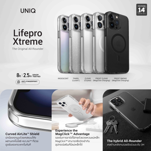 • รุ่น LIFEPRO XTREME และ รุ่น LIFEPRO XTREME (MagClick Charging) ออกแบบมาให้มีความเงาใส น้ำหนักเบาและบางเป็นพิเศษ เคสด้านหลังผลิตจากวัสดุ PC มาตรฐานป้องกันรอยขีดข่วนระดับ 3H ส่วนขอบกันกระแทกผลิตจากวัสดุ TPU ผสานการปกป้องขั้นสุดด้วยเทคโนโลยี AirLite™ ช่วยปกป้องไอโฟนและดูดซับแรงกระแทกรอบด้านทั้ง 4 มุมได้อย่างเต็มประสิทธิภาพ พร้อมเพิ่มความปลอดภัยให้เลนส์ด้วยขอบรอบเลนส์ยกสูง ผ่านการทดสอบว่าสามารถรองรับแรงกระแทกจากการตกจากที่สูงได้ถึง 8 ฟุต (2.5 เมตร) เคสรุ่น LIFEPRO XTREME (MagClick Charging) รองรับการชาร์จไร้สายด้วยวงแหวนแม่เหล็ก MagClick™ รวมถึงสามารถยึดติดเข้ากับอุปกรณ์เสริมที่มีแม่เหล็กแบบต่างๆได้ UNIQ รุ่น LIFEPRO XTREME มี 3 สี ได้แก่ สี CLEAR (Crystal) วางจำหน่ายในราคา 750 บาท สี TINSEL (Lucent) และ สี IRIDESCENT วางจำหน่ายในราคา 850 บาท รุ่น LIFEPRO XTREME (MagClick Charging) มี 2 สี ได้แก่ สี FROST CLEAR และ สี FROST SMOKE วางจำหน่ายในราคา 990 บาท