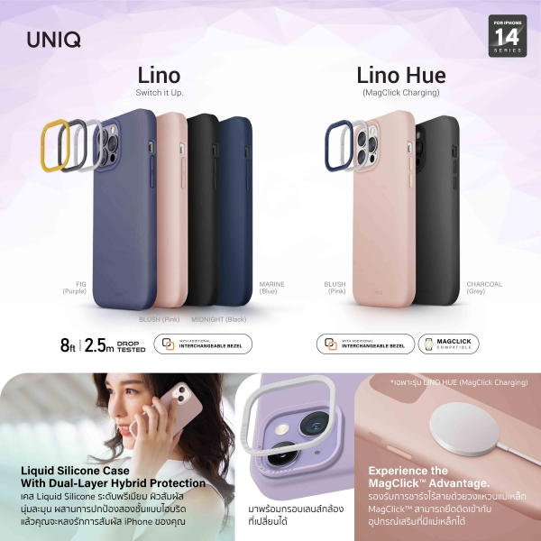 • รุ่น LINO และ รุ่น LINO HUE (MagClick Charging) ตัวเคสผลิตจากวัสดุ Liquid Silicone เกรดพรีเมียม มาพร้อมเทคโนโลยีการเคลือบผิวที่ช่วยลดการดูดซับฝุ่น รวมถึงป้องกันการเกิดลายนิ้วมือและรอยเปื้อนได้อย่างดีเยี่ยม ด้านในบุด้วย Microfiber ผสานการปกป้องอย่างสมบูรณ์แบบจากการกระแทก 2 ชั้นแบบไฮบริด ผ่านการทดสอบว่าสามารถรองรับแรงกระแทกจากการตกจากที่สูงได้ถึง 8 ฟุต (2.5 เมตร) มาพร้อมกรอบเลนส์กล้องที่สามารถเปลี่ยนได้ ช่วยเพิ่มลูกเล่นในการตกแต่งขอบรอบเลนส์กล้องให้สนุกยิ่งขึ้น LINO HUE (MagClick Charging) รองรับการชาร์จไร้สายด้วยวงแหวนแม่เหล็ก MagClick™ รวมถึงสามารถยึดติดเข้ากับอุปกรณ์เสริมที่มีแม่เหล็กแบบต่างๆได้ UNIQ รุ่น LINO มี 5 สี ได้แก่ สี BLACK (Midnight), สี PINK (Blush), สี BLUE (Marine), สี LAVENDER (Lilac), สี PURPLE (Fig) และรุ่น LINO HUE (MagClick Charging) มี 2 สี ได้แก่ สี GREY (Charcoal), สี PINK (Blush) วางจำหน่ายในราคา 1,190 บาท