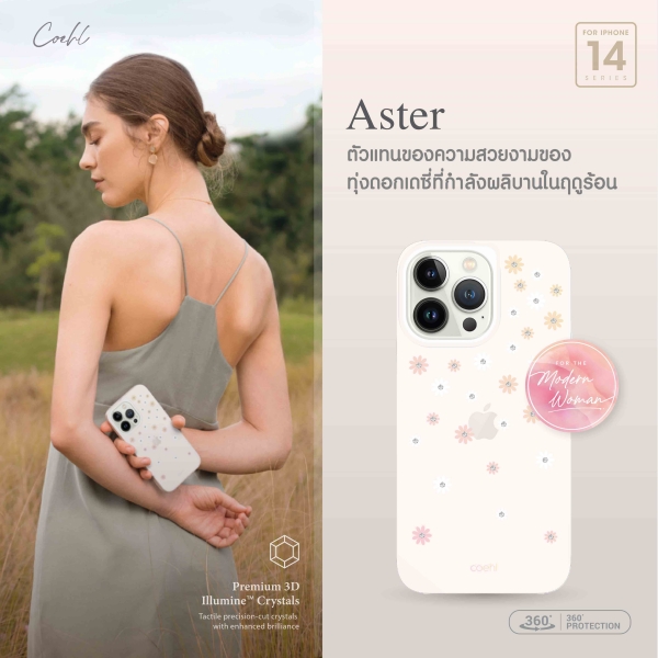 • รุ่น Aster เคสใสที่เป็นตัวแทนของความสวยงามของทุ่งดอกเดซี่ที่กำลังผลิบานในฤดูร้อน เพิ่มความหรูหราด้วยเม็ดคริสตัลระดับพรีเมียม 3 มิติที่ฝังอยู่ในตัวเคส ช่วยให้เคสของคุณดูสวยหรูและมีมิติมากยิ่งขึ้น ผลิตจากวัสดุ IML TPU COEHL by UNIQ รุ่น Aster มี 1 สี คือ สี SPRING PINK วางจำหน่ายในราคา 1,390 บาท