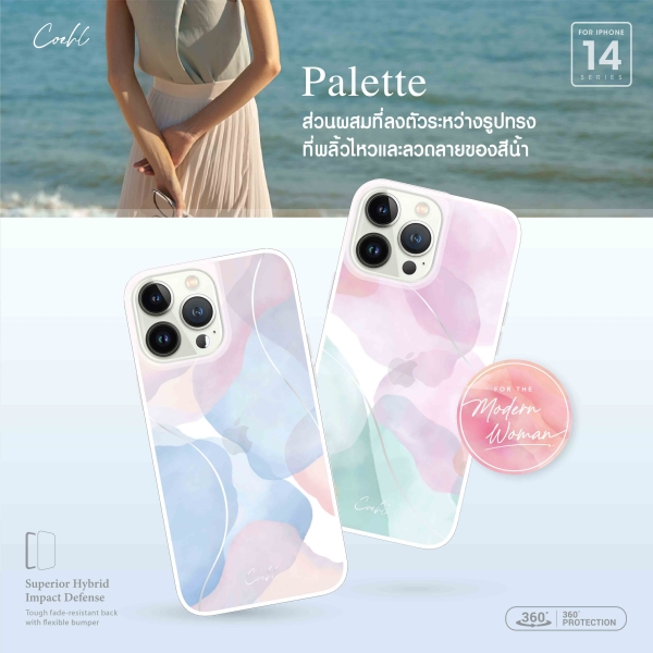 • รุ่น Palette เคสโปร่งแสงที่โดดเด่นด้วยลายเส้นที่พลิ้วไหวและลวดลายของสีน้ำ มาพร้อมดีไซน์เพรียวบางผลิตจากวัสดุ IML TPU COEHL by UNIQ รุ่น Palette มี 2 สี ได้แก่ สี SOFT LILAC และ สี DUSK BLUE วางจำหน่ายในราคา 890 บาท