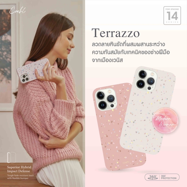 • รุ่น Terrazzo เคสที่ผสานความทันสมัยของลายหินขัดและเทคนิคของช่างฝีมือจากเมืองเวนิสได้อย่างลงตัว ผลิตจากวัสดุ IML TPU เนื้อแข็ง ด้านในซับด้วยวัสดุ Microfiber COEHL by UNIQ รุ่น Terrazzo มี 2 สี ได้แก่ สี CORAL PINK และ สี SANDSTONE วางจำหน่ายในราคา 890 บาท