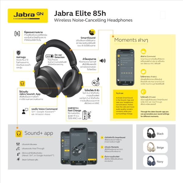 - การวางจำหน่ายครั้งแรกในประเทศไทย ของJabra Elite 85H หูฟังอัจฉริยะ มาพร้อมกับระบบ Smart Active Noise Cancellation และ AI สามารถปรับเสียงตามสภาพแวดล้อมได้โดยอัตโนมัติ และจะจดจำการใช้งานของเรา นอกจากนี้ยังมาพร้อมระบบรับสายและวางสายโทรศัพท์ให้โดยอัตโนมัติ มีให้เลือกทั้งหมด 3 สี คือ สีดำ Black, สีเบจ Beige และสีน้ำเงิน Navy ราคาวางจำหน่าย 10,990 บาท