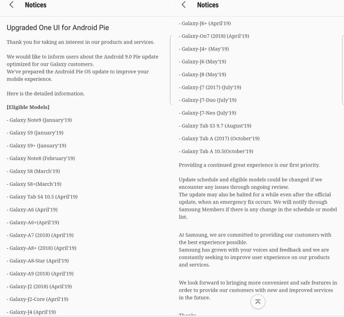 สำหรับรุ่นอื่นๆ ที่จะได้ Android 9.0 Pie เพิ่มเติม ได้แก่ Galaxy A8 (A8+ และ A8 Star), A6, A6+, J2 (2018), J2 Core, J8 และ J7 Neo รวมไปถึงแท็บเล็ต Galaxy Tab S3 9.7 ด้วย