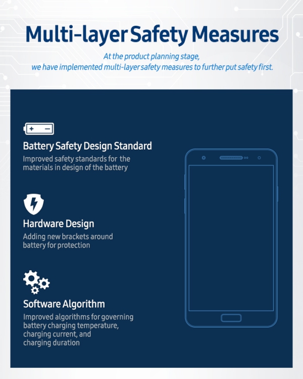 นอกจากนี้แล้ว Samsung ได้ออกมาตรการตรวจสอบความปลอดภัยหลายชั้น (Multi-layer Safety Measures Protocol) สำหรับเป็นขั้นตอนในการวางแผนการผลิตของซัมซุงให้มีกระบวนการหลากหลายพื่อความปลอดภัยของสมาร์ทดีไวซ์เพื่อเน้นย้ำความปลอดภัยในผลิตภัณฑ์ และได้จัดตั้งคณะที่ปรึกษาด้านแบตเตอรี่ ที่ได้รวมรวบทั้ง ที่ปรึกษาผู้เชี่ยวชาญด้านวิชาการและการค้นคว้า เพื่อให้มั่นใจในความปลอดภัยสูงสุดของแบตเตอรี่และนวัตกรรม