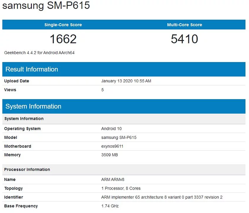อ้างอิงจากผลทดสอบของโมเดล SM-P615 จะขับเคลื่อนด้วยหน่วยประมวลผล Exynos 9611 ที่ใช้กับสมาร์ทโฟนรุ่น Galaxy M30s และ Galaxy A50s ซึ่งอาจมีความจุที่ 64GB และ 128GB ควบคู่กับการใช้งานนปากกา S-Pen ทั้งนี้ ยังควบคู่กับ RAM 4GB และรันบนระบบปฏิบัติการ Android 10 ตั้งแต่แกะกล่อง