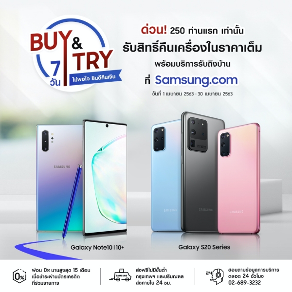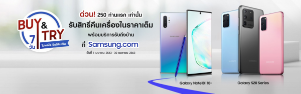 ซัมซุง ใจดี จัดแคมเปญเอาใจช่วง อยู่บ้านหยุดเชื้อช่วยชาติ  “Buy & Try” แคมเปญที่จัดให้ลูกค้าซื้อเครื่องไปก่อน แล้วให้ลองใช้ 7 วัน หากไม่พอใจสามารถรับสิทธิ์คืนเครื่อง คืนเงินภายใน 7 วัน โดยซัมซุงจะมารับเครื่องคืนถึงหน้าบ้าน เมื่อสั่งซื้อ Samsung Galaxy Note 10, Note 10+, S20, S20+ หรือ S20 Ultra 5G ตั้งแต่วันนี้ – 30 เม.ย. 63 ผ่าน Samsung.com (https://shop.samsung.com/th/) เฉพาะ 250 ท่านแรกเท่านั้น!!