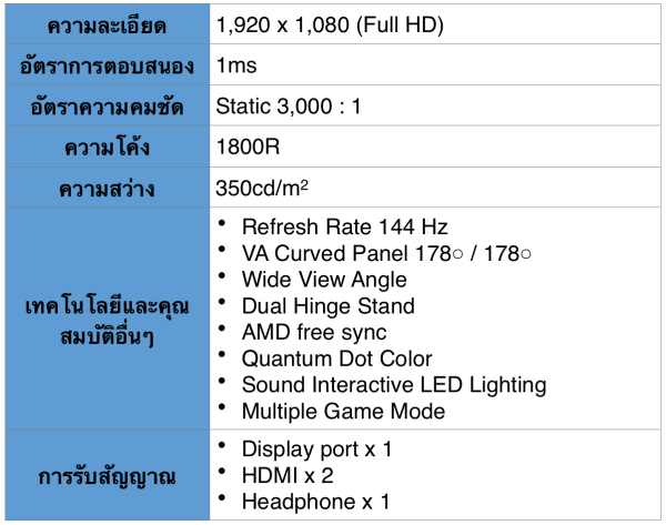 ข้อมูลผลิตภัณฑ์ซัมซุง มอนิเตอร์จอโค้งสำหรับเล่นเกม รุ่น CFG70