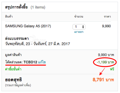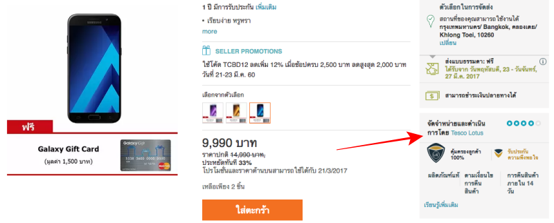 Samsung Galaxy A5 (2017) ราคาที่ว่านี้มาจาก Tesco Lotus ที่นำมาจัดโปรโมชั่นบนเว็บไซต์ Lazada นั่นเอง โดยลดเหลือเพียง 9,990 บาท (จากราคาปกติ 14,490 บาท) พร้อมรับเงินคืนผ่าน Galaxy Gift Card 1,500 บาท มาดูกันว่าซื้อยังไงให้เหลือเพียง 7,291 บาท