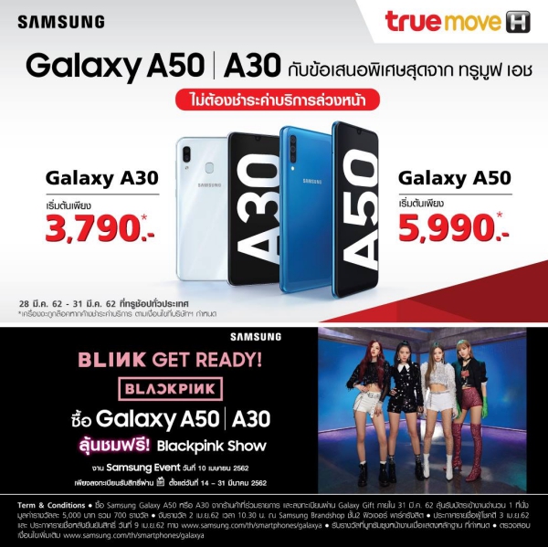 พิเศษเพื่อชาว BLINK !! ลุ้นบัตรเข้างาน Samsung Event พร้อมชม BLACKPINK Show จำนวน 1 ที่นั่ง มูลค่ารางวัลละ 5,000 บาท รวม 700 รางวัล (สำหรับลูกค้าที่ซื้อ Galaxy A50 l A30 จากทรูมูฟเอช ภายในวันที่ 31 มีนาคม 2562 เท่านั้น)